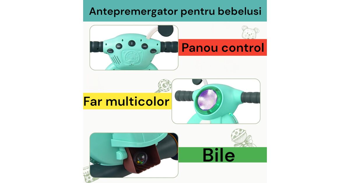 - ✨ Lumini multicolore: Efecte de lumină spectaculoase distrează bebelușul și stimulează dezvoltarea vizuală.