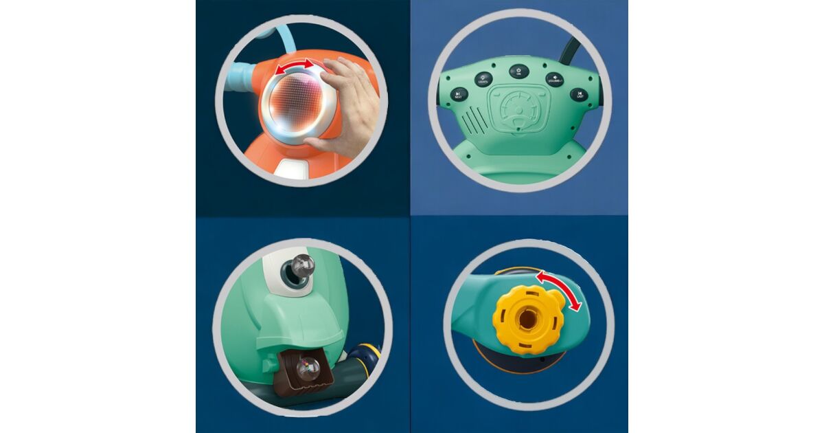 - Sunete și lumini distractive: Efectele sonore și luminoase integrate îi captivează pe cei mici și îi încurajează să se miște.