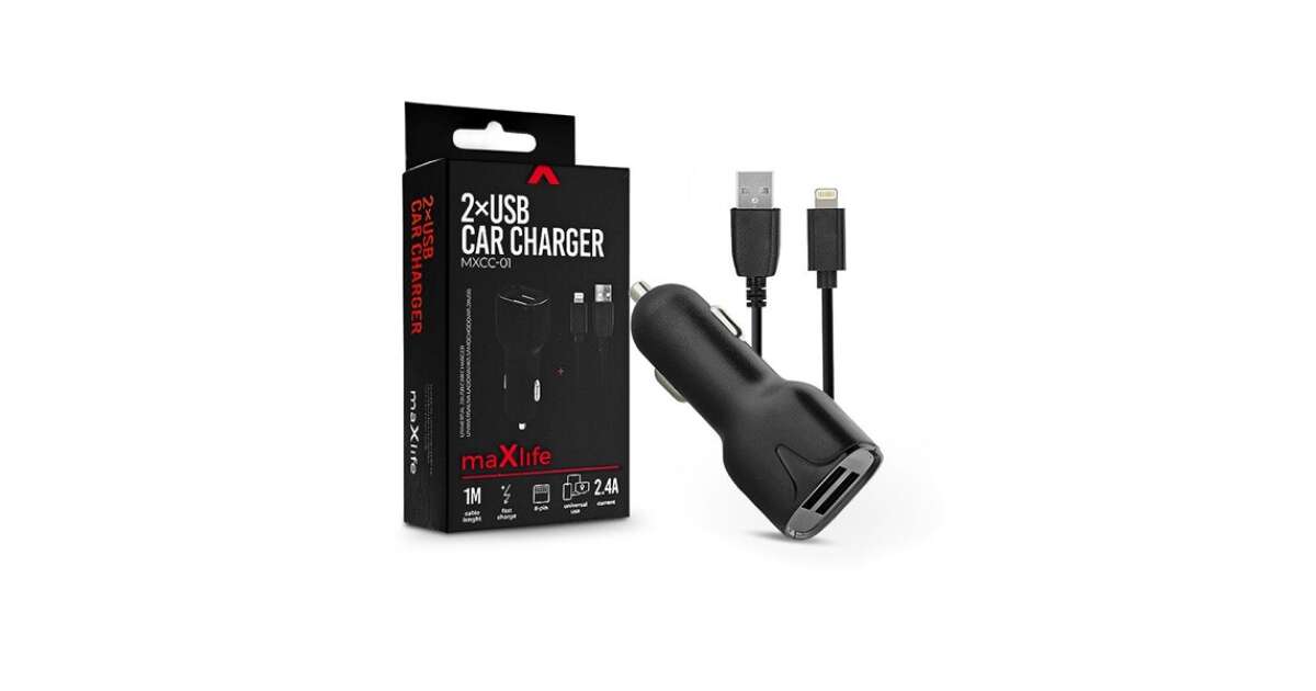 Incarcator auto Maxlife, MXCC-01, 2x USB 2.4A, cablu Lightning, Negru Descriere