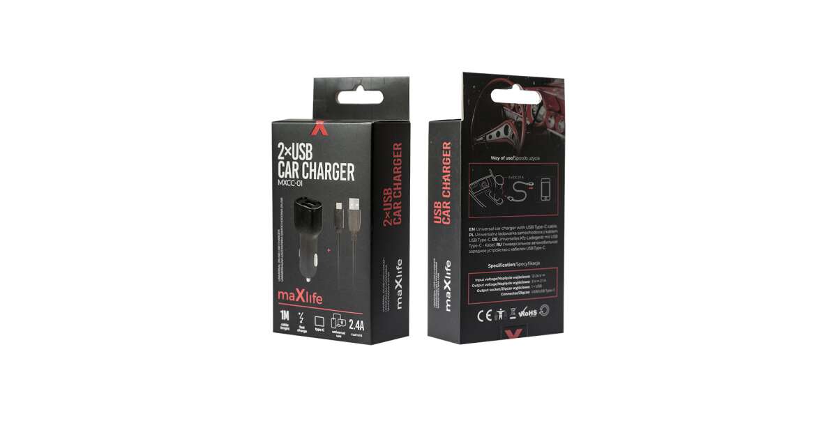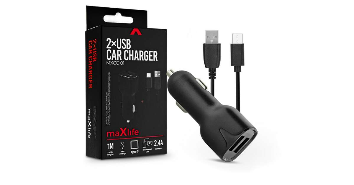 Incarcator auto Maxlife, MXCC-01, 2x USB 2.4A, cablu USB-C, Negru