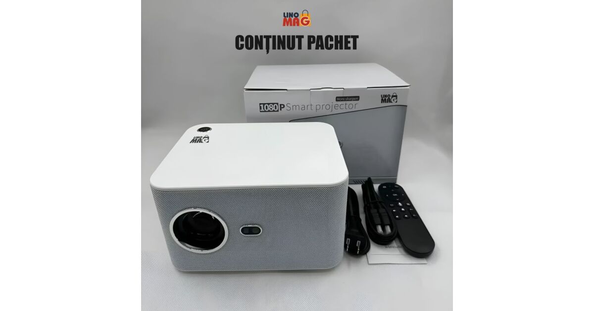 Videoproiector Smart Portabil, Linomag®, 4K Full HD 1080P, 350 ANSI, Autofocus, Android 11, WiFi, Bluetooth, Difuzor Integrat, Telecomandă, Alb/Gri Perlat