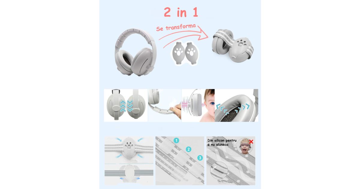 Casti Antifonice 2 in 1 Pentru Bebelusi si Copii 3-48 luni WePro Store, Bentita Elastica Moale si Clasica Superioara, protectie auditiva in medii zgomotoase, Anulare a Zgomotului la 25dB, Gri Descriere