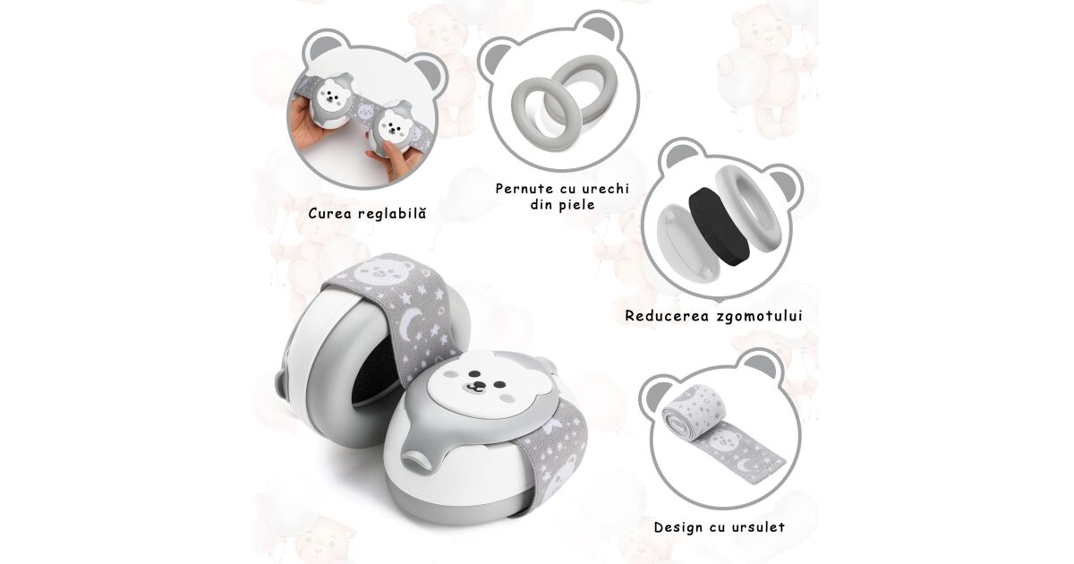 Casti antifonice pentru copii si bebelusi 3-36 luni WePro Store, protectie auditiva in medii zgomotoase, sistem de prindere sigur pentru fontanela, bentita elastica, usor de folosit, Gri cu A Descriere