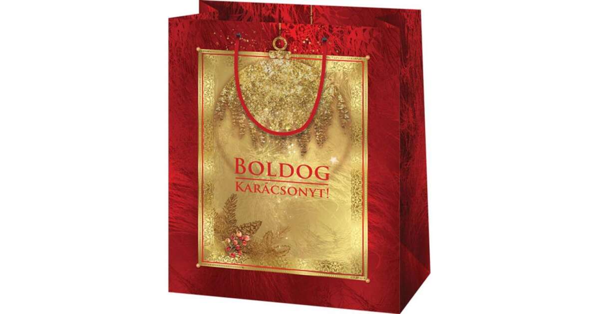 Sac cadou exclusivist de dimensiuni mici cu inscripția "Boldog Karácsonyt" (Crăciun Fericit), 11x6x15cm Descriere