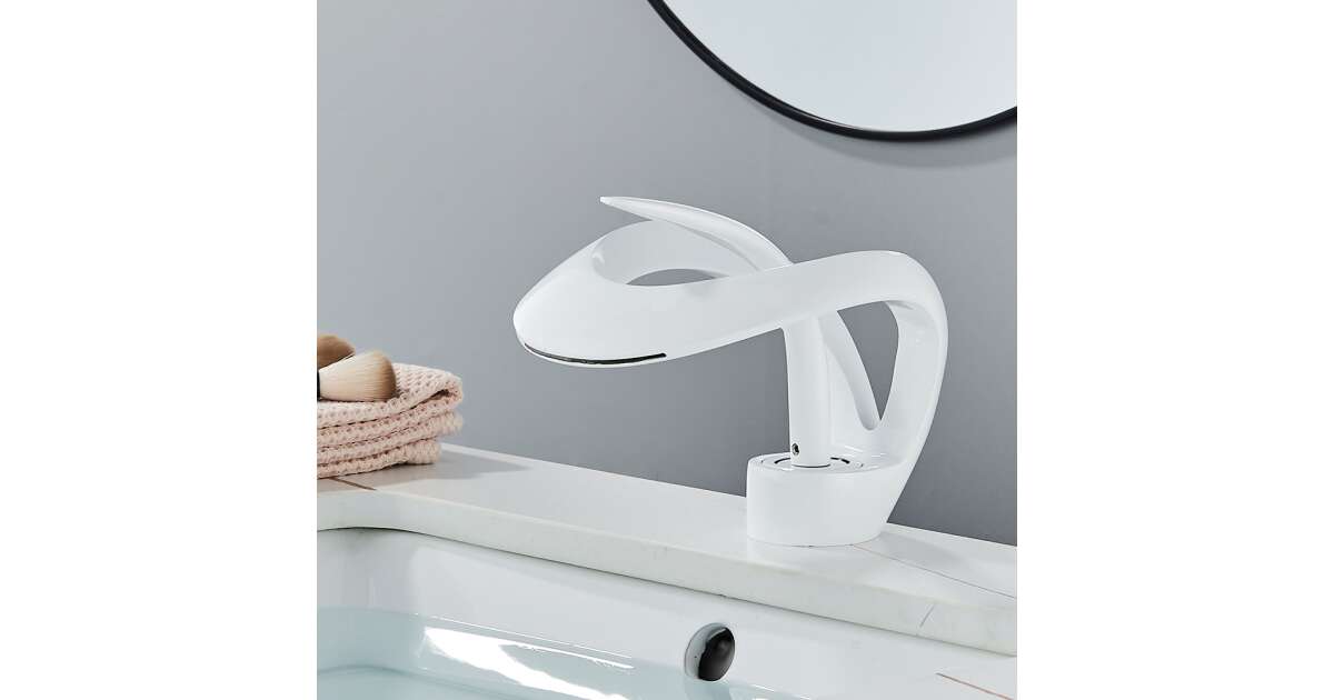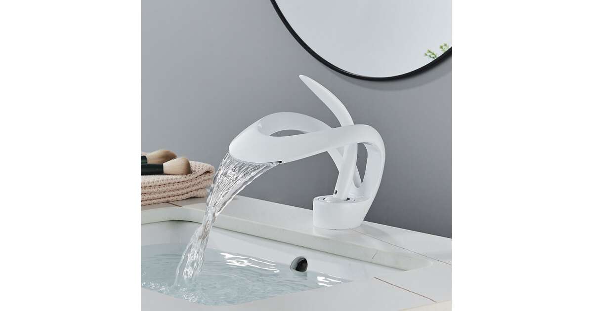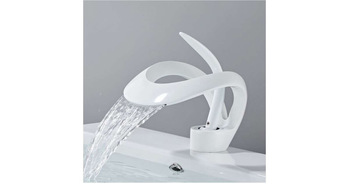 Baterie chiuveta baie, Blackswan, Tip M215, model alb scurt cu pipa tip cascada, dimensiune 15 cm Descriere