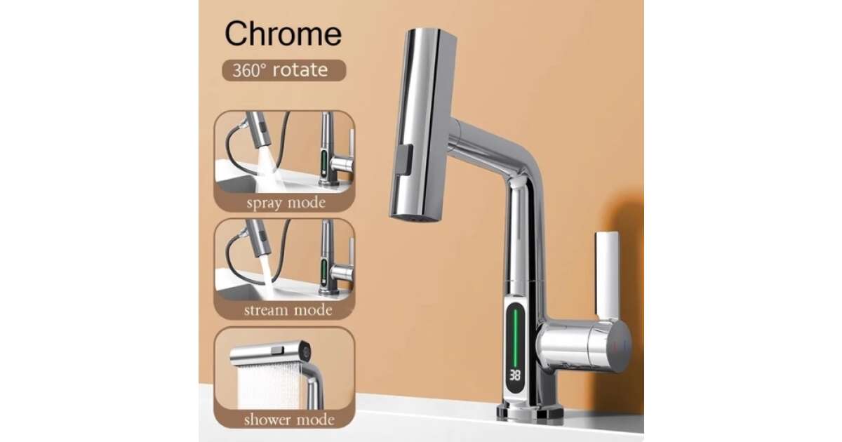 Baterie chiuveta baie, Blackswan, Tip M325, model smart crom, cu display LCD, 3 moduri si dus cascada mobil, dimensiune 23 cm Descriere