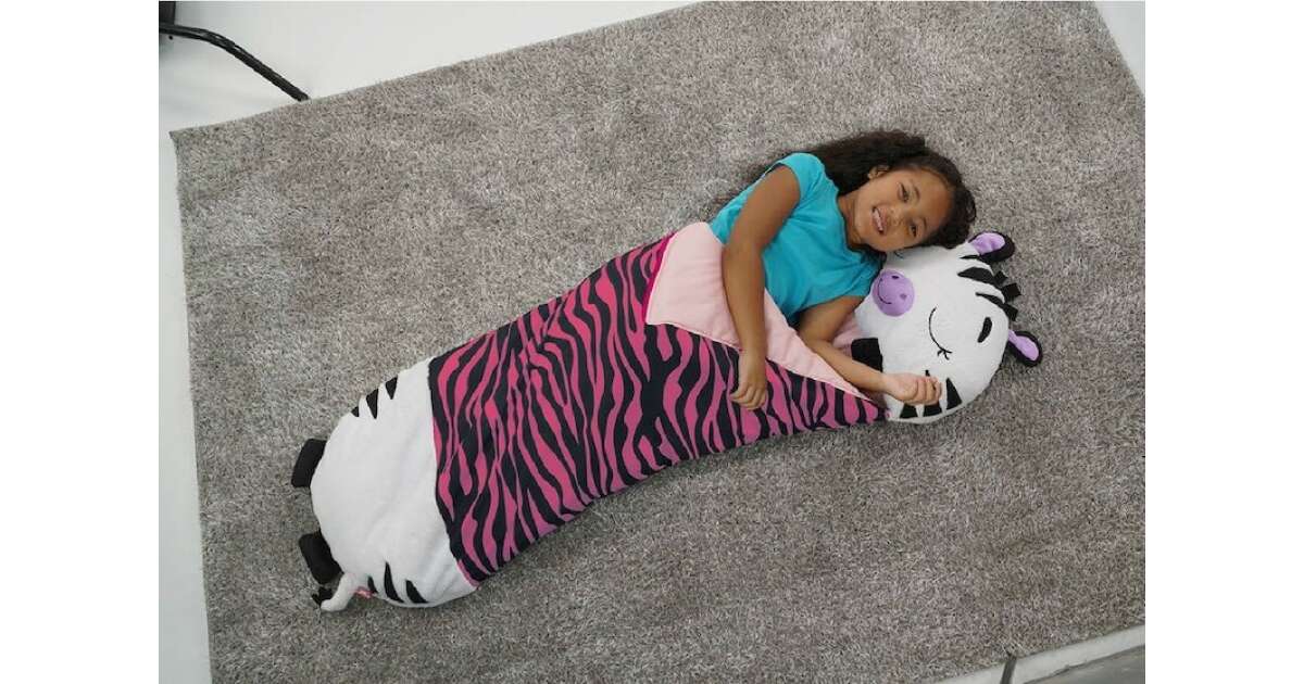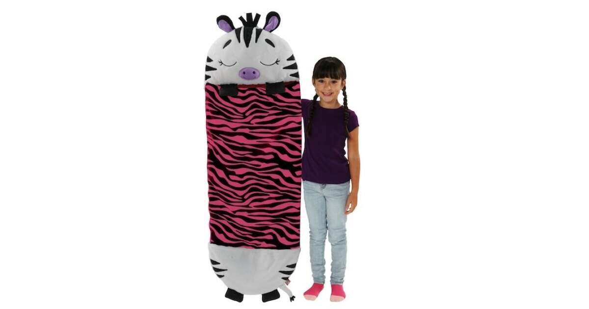 Sacul de dormit și perna Happy Nappers din pluș Zebra este cadoul perfect pentru orice copil care iubește confortul, culorile vesele și plușul moale! 🥰