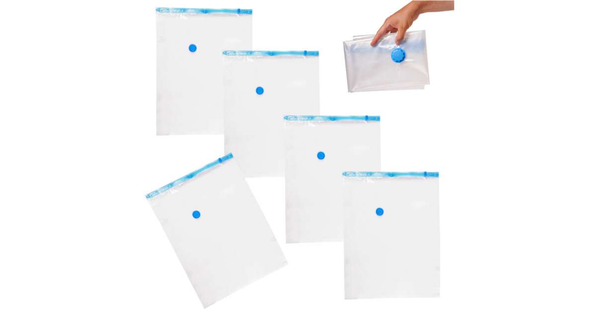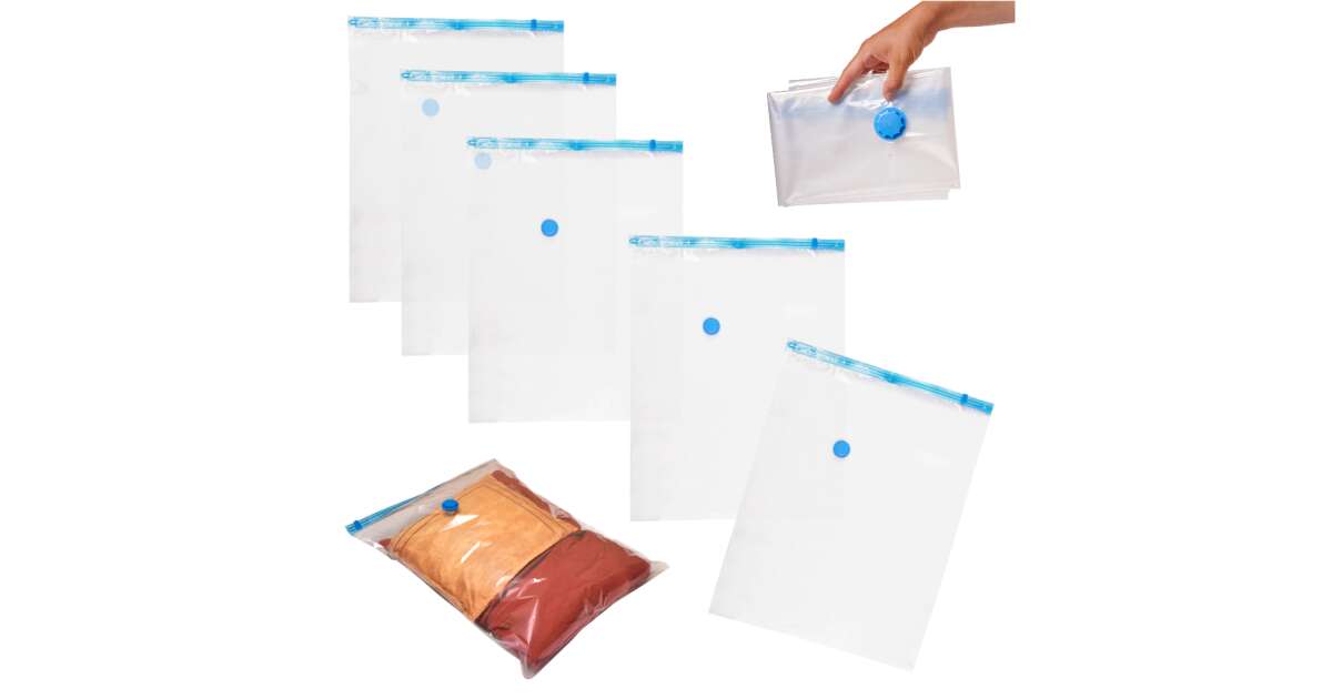 Set de cinci saci de vid mari (60x80 cm) cu care poți reduce cu până la 80% spațiul ocupat de haine și alte lucruri în dulap sau valiză! Ideali pentru haine de sezon, pături, lenjerie de pat sau pentru împachetat atunci când călătorești.