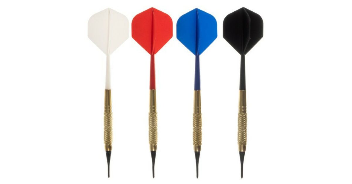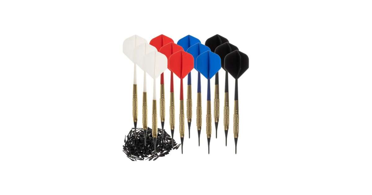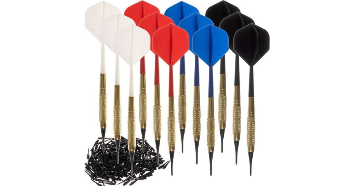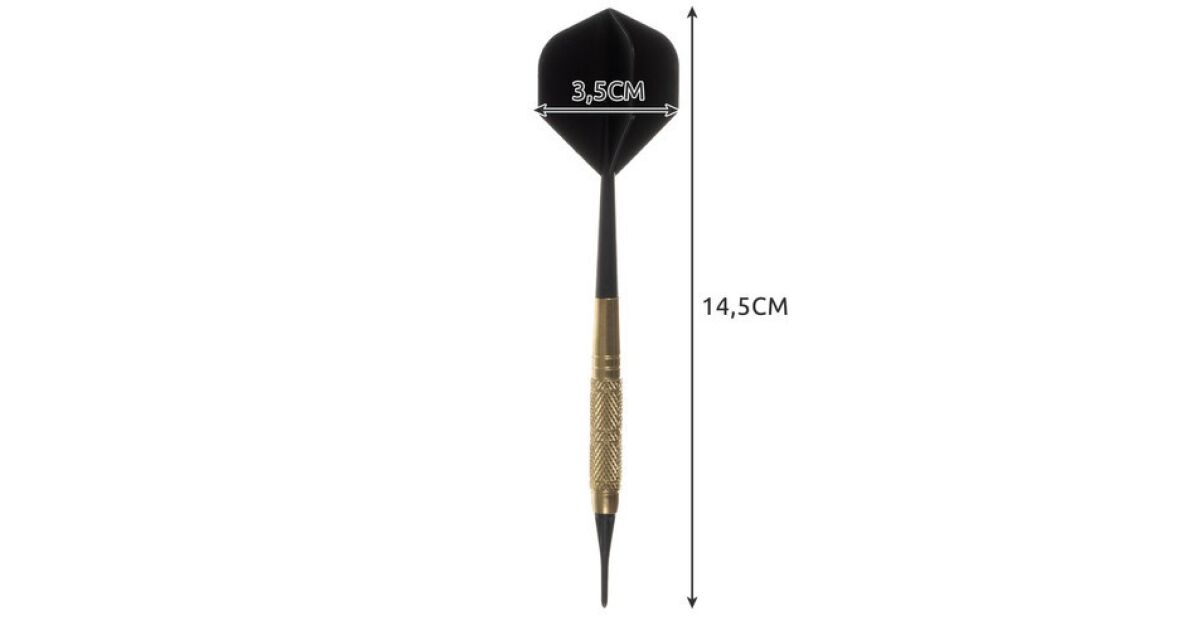 Acest set de 12 darts este alegerea ideală atât pentru începători, cât și pentru jucătorii experimentați! Pachetul conține 12 darts metalice aurii, de 18 grame, cu 4 culori diferite de aripioare (alb, roșu, albastru, negru), plus 200 de vârfuri moi de schimb. Lungimea săgeților este de 14,5 cm, iar diametrul de 0,8 cm.
