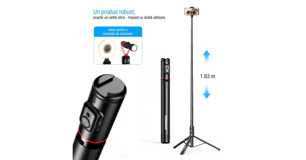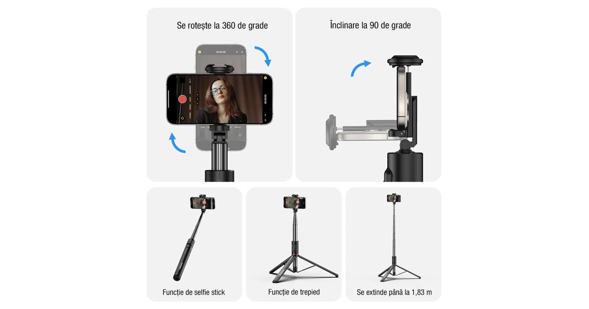 - Versatilitate maximă: Funcție de selfie stick, trepied și monopied într-unul singur.