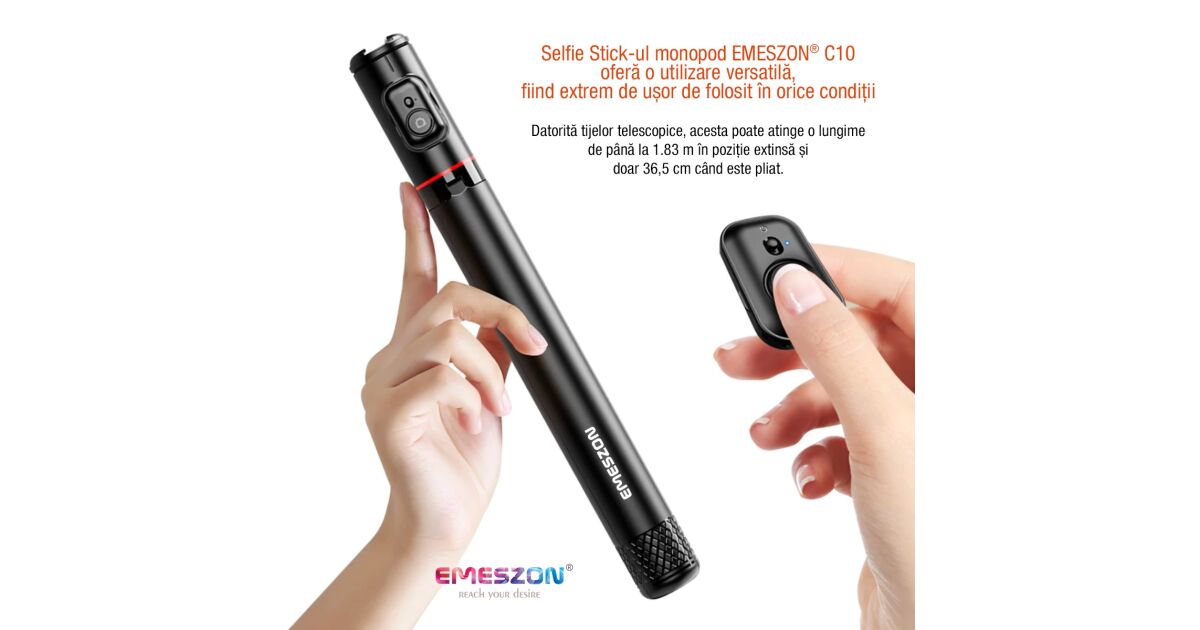 Selfie Stick Telescopic Profesional cu Trepied - Monopied, EMESZON® C10, Lungime 36.5 - 183 cm, Telecomanda Bluetooth, Negru Descriere