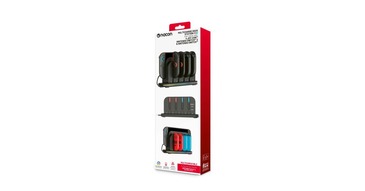 Nacon Multicharge Dock este o stație de andocare multifuncțională pentru consolele Nintendo Switch și Switch 2, care încarcă simultan până la 4 controllere Joy-Con, răcorește consola și adaugă un plus de stil postului tău de gaming cu iluminare RGB unică. Este alegerea perfectă pentru cei care doresc să-și mențină echipamentul ordonat și gata de joc.