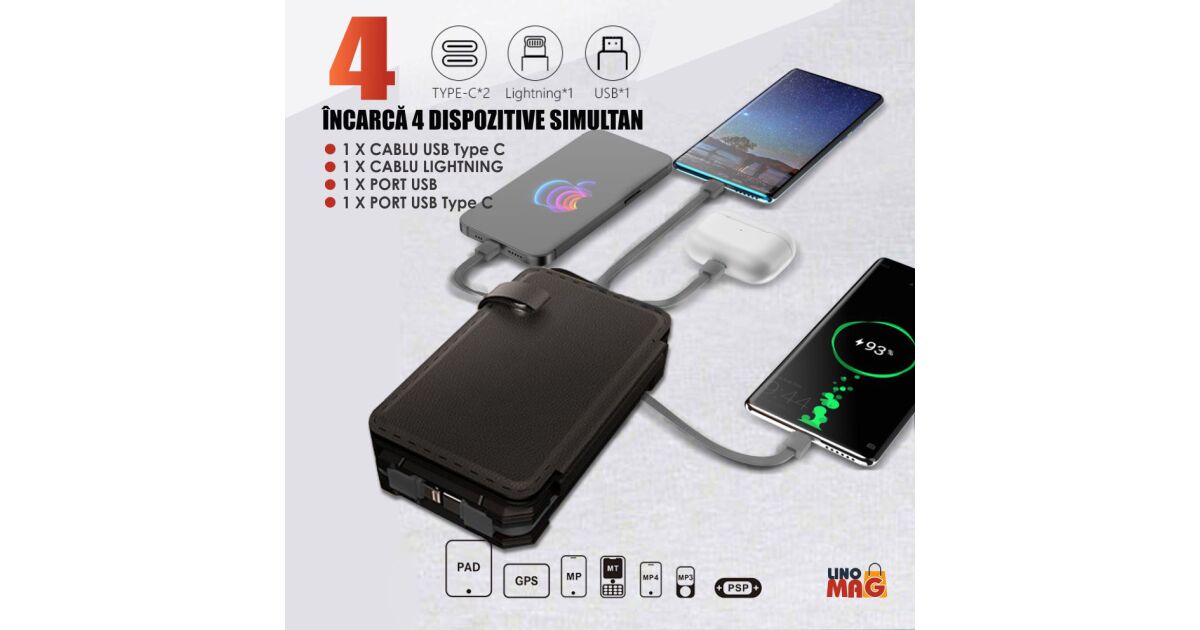 Baterie Externa Solara Linomag®, Power Bank 8000 mAh, 4 Panouri, 1x cablu Lightning & 1x cablu USB Type-C incluse, Waterproof, Negru mat, 11.4 x 6.8cm Descriere
