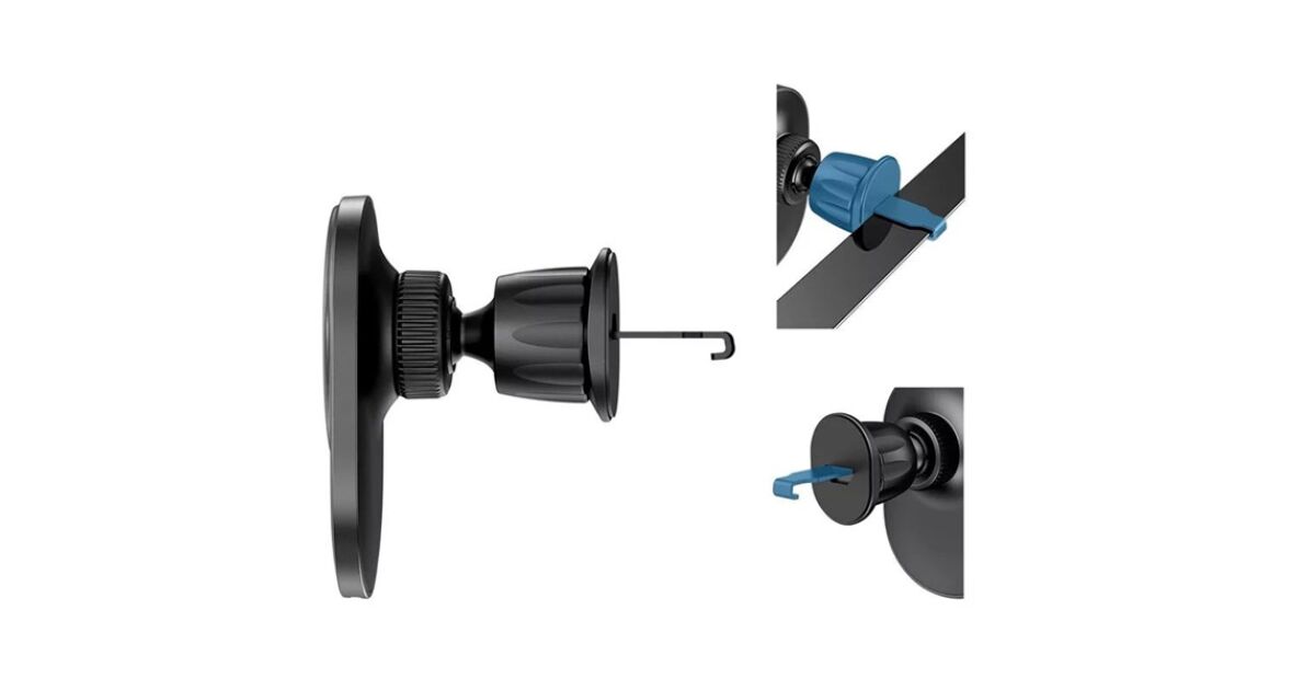 Datorită celor două capete interschimbabile, poți fixa cu ușurință suportul pe bord sau pe grila de ventilație. Clema practică cu sistem de prindere permite instalarea în aproape orice tip de mașină.