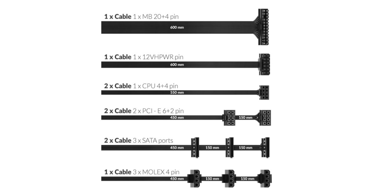 Conținutul pachetului: Sursă de alimentare, cablu de alimentare de 1,5m, cabluri, cablu 12VHPWR.
