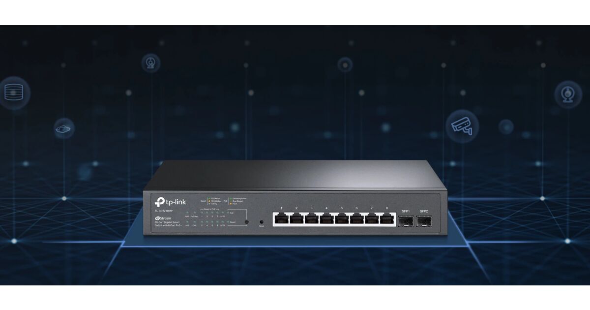Acest switch Gigabit Smart TP-Link JetStream TL-SG2210MP cu 10 porturi este ideal pentru rețelele de acasă sau pentru micile afaceri. Dispune de 8 porturi cu suport PoE+, astfel încât poți conecta cu ușurință dispozitive compatibile PoE, cum ar fi camerele IP sau punctele de acces wireless, fără a mai fi nevoie de cabluri de alimentare separate.