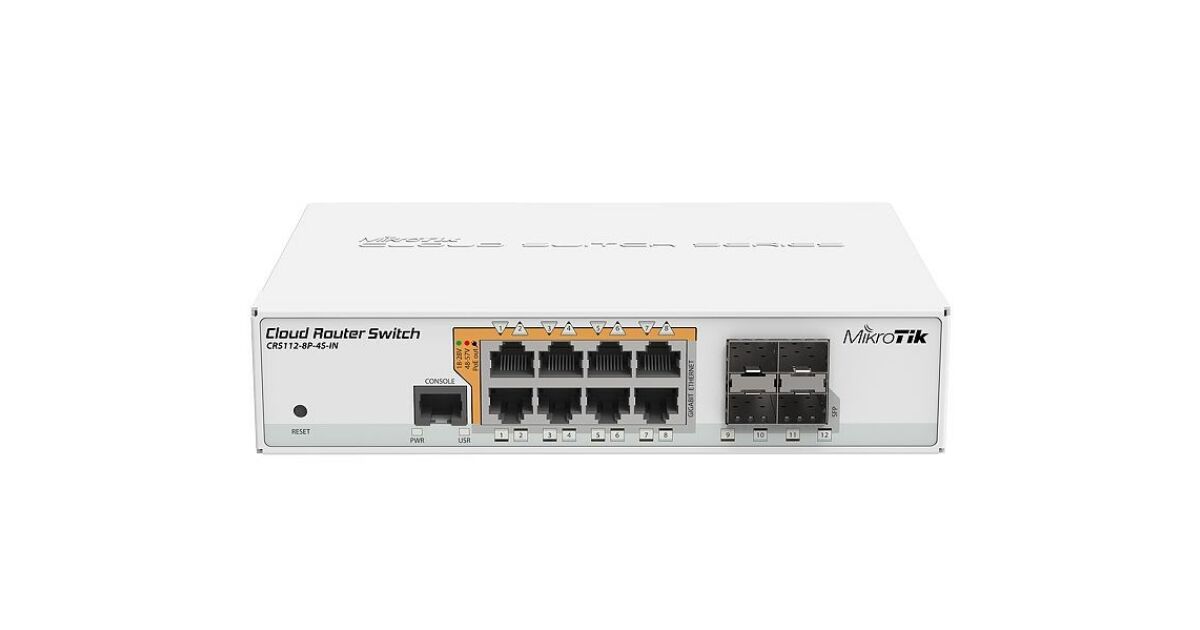 Switch Mikrotik, Cloud Router CRS112-8P-4S-IN, 8x porturi RJ45 POE/POE+, 4x porturi SFP gigabit, RouterOS L5 sau SwitchOS (CRS112-8P-4S-IN) Descriere