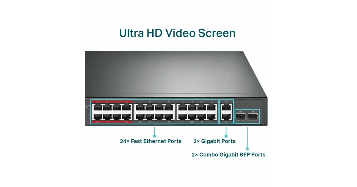 - 24 x porturi RJ45 PoE+ 10/100 Mbps: Furnizează și alimentare cu energie dispozitivelor conectate (buget PoE total de 250W).