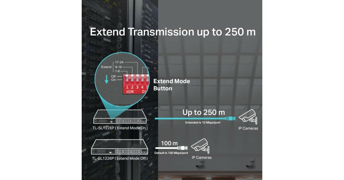 - Mod extins (Extend Mode): Alimentare PoE și transfer de date până la 250 de metri.