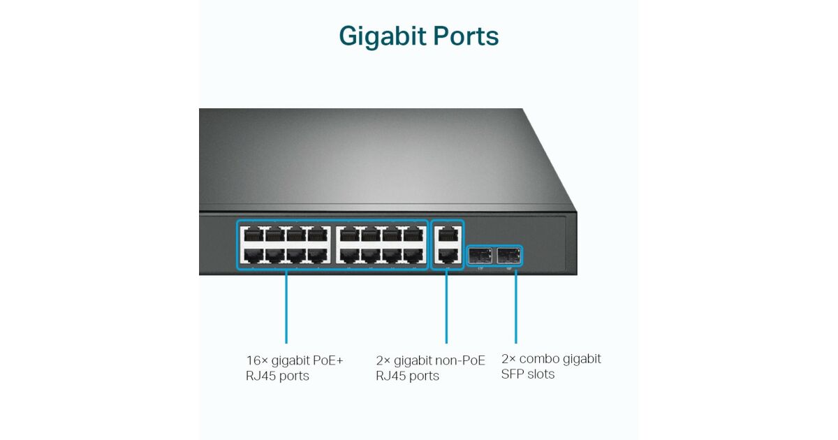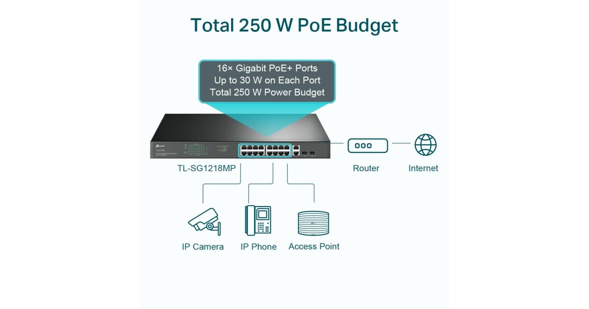 Acest switch Gigabit PoE+ TP-Link TL-SG1218MP cu 18 porturi este ideal pentru configurarea rețelelor de acasă sau de la birou. Datorită celor 16 porturi PoE+, poți conecta cu ușurință camere IP, telefoane IP, puncte de acces și alte dispozitive PoE, fără a fi nevoie să tragi cabluri de alimentare suplimentare.