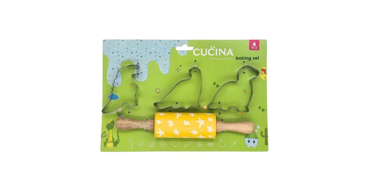 Acest set de 4 tăietori de biscuiți este alegerea perfectă pentru coacere creativă, cu forme vesele de dinozauri! Setul include trei tăietori de biscuiți diferiți în formă de dinozaur (T-Rex, Stegosaurus și Brontosaurus) și un sucitor cu model de stele.