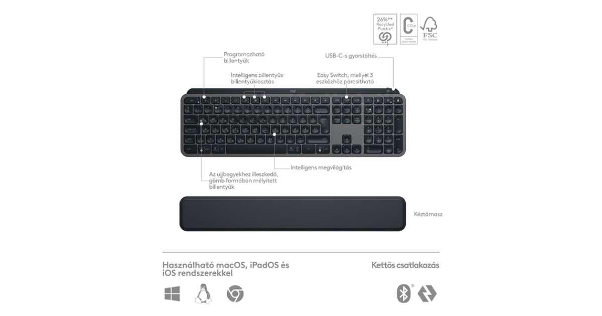 Tastatura wireless Logitech MX Keys S, Iluminare, Palmrest, 2.4GHz&Bluetooth, USB-C, US INTL layout, Graphite (920-011589) Descriere