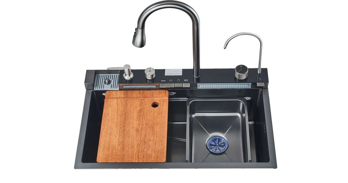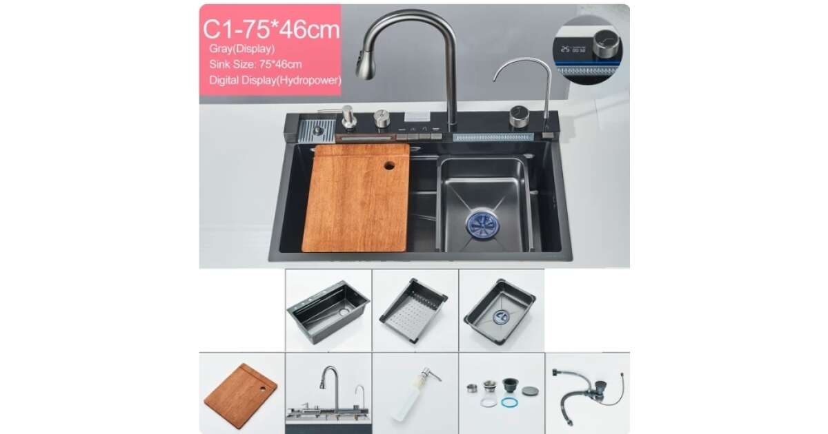 Set chiuveta multifunctionala bucatarie, baterie si accesorii, Blackswan, Tip C1, model negru/ gri antracit, baterii tip cascada si pentru apa purificata, display digital, dimensiune 75 x 46 cm Descriere