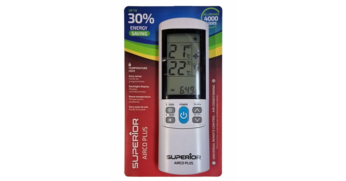 Cu telecomanda universală pentru aer condiționat Superior Airco Plus, poți controla cu ușurință aparatul tău de aer condiționat. Nu necesită configurare, doar introduci bateriile și ești gata de utilizare! Compatibilă cu numeroase modele, este alegerea ideală pentru a înlocui telecomanda veche.