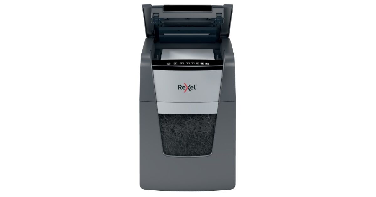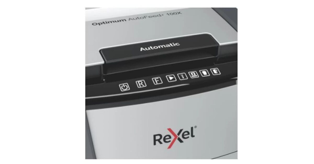 Distrugator documente automat REXEL OPTIMUM 100X, P4, cross-cut (confeti), 100 coli, cos 34l, negru-gri (2020100XEU) Descriere