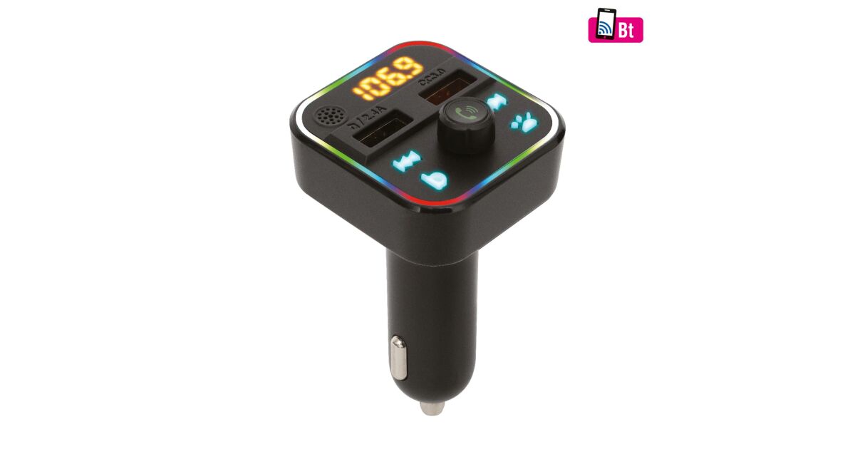 Difuzor și încărcător auto SAL FMBT 18RGB, 5 în 1, modulator FM, încărcător rapid USB dublu, contor de tensiune, buton de amplificare a basului Descriere