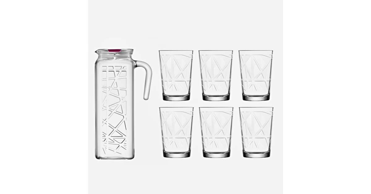 Set recipient pentru servit bauturi si pahare model geometric, Transparent, 1 recipient 1.2 l, 6 pahare 200 ml Descriere