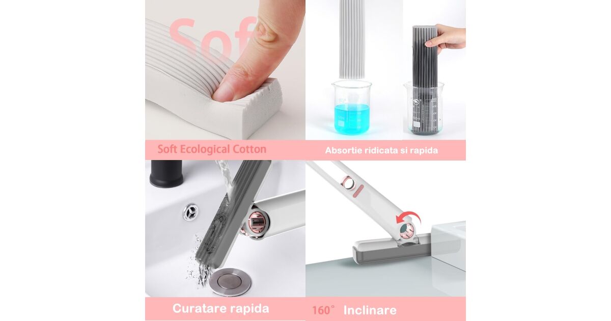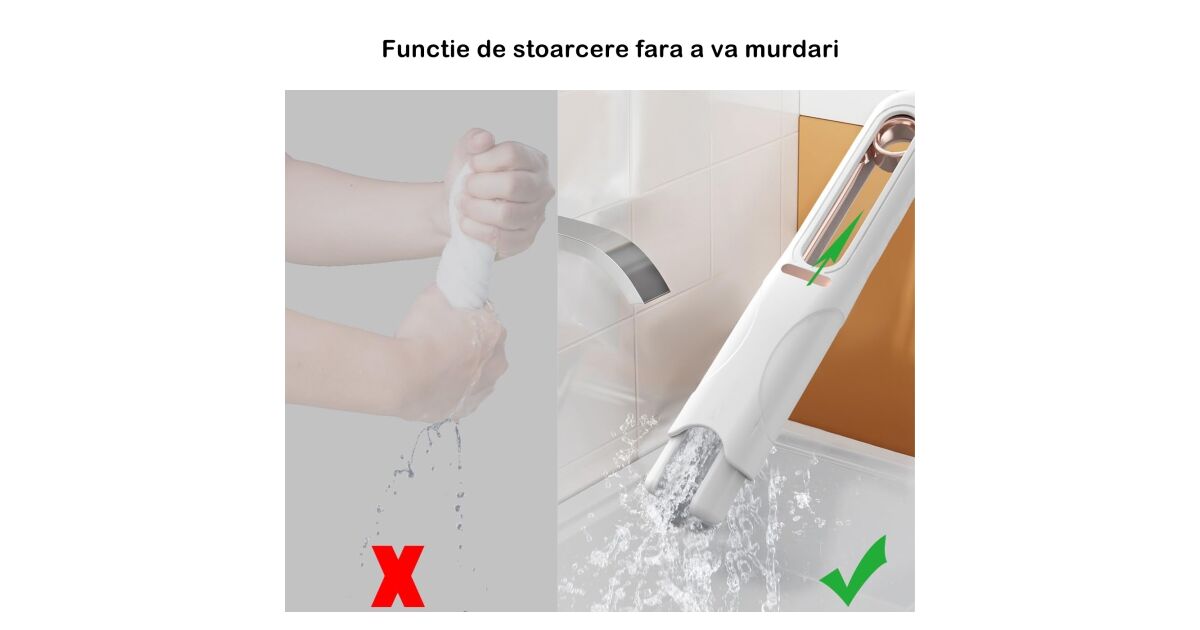 Acest mop compact, portabil, revoluționează curățenia de zi cu zi! Este potrivit atât pentru curățare umedă, cât și uscată, fără a-ți murdări mâinile. Datorită sistemului practic de stoarcere, poți stoarce buretele în câteva secunde.
