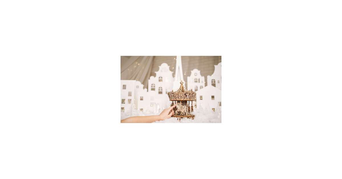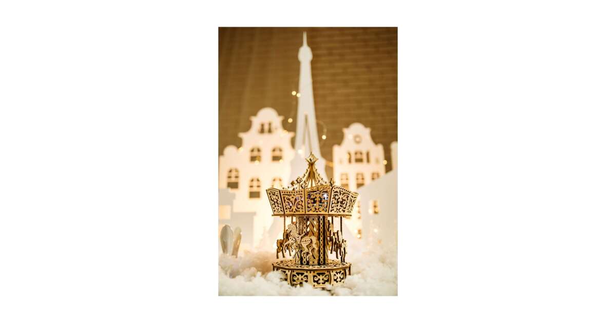 Postavte si svoj vlastný, čarovný parížsky kolotoč s týmto detailným 3D dreveným puzzle! Táto 440-dielna súprava vytvorí úžasný mechanický kolotoč, ktorého kone a jednorožce sa otáčajú a pohybujú hore a dole. Zabudované LED osvetlenie dodáva extra sviatočnú atmosféru, zatiaľ čo slávna melódia "La Vie en Rose" napĺňa miestnosť. Vyrobené z vysoko kvalitnej, ekologickej, leštenej preglejky, ľahko sa montuje bez lepidla.
