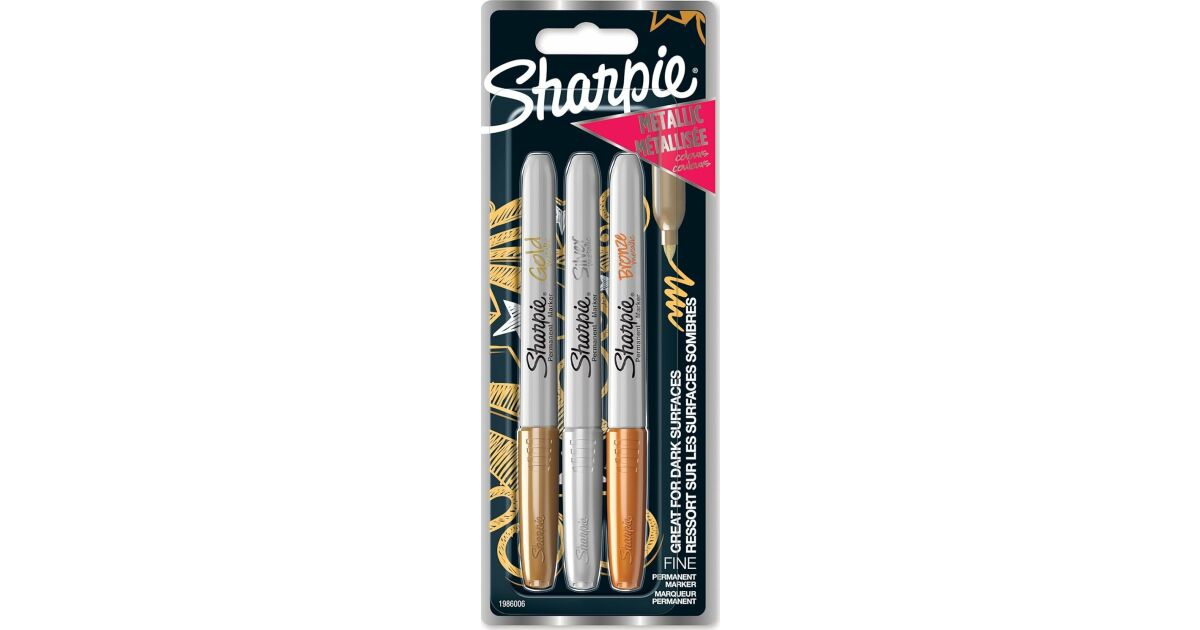 Táto sada alkoholových fixiek Sharpie Metallic obsahuje 3 fixky s hrotom 0,9 mm s metalickým efektom. Ideálne na kreslenie a písanie na tmavé povrchy. ✨