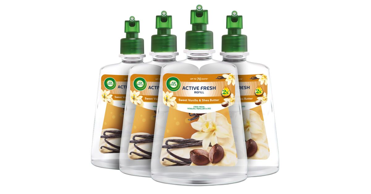 *Používa sa pri použití s novým Air Wick Active Fresh (podľa piktogramov) a pri nastavení prístroja na najnižší stupeň. **Vôňa je naplnená 2x väčším množstvom prírodných esenciálnych olejov v porovnaní s predchádzajúcim zložením Air Wick.