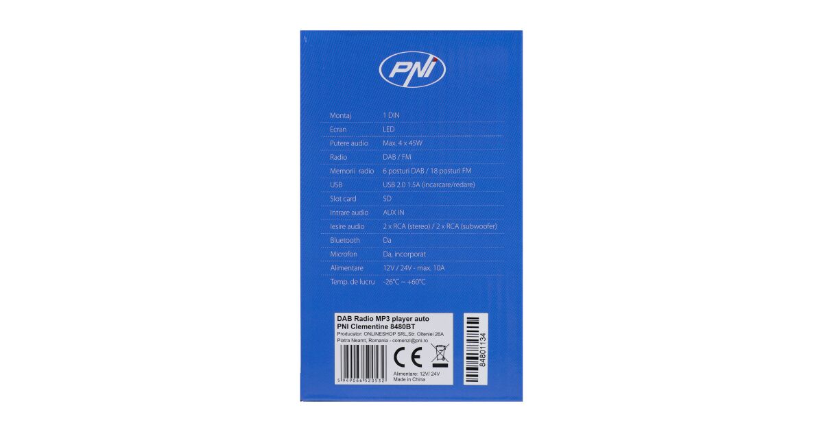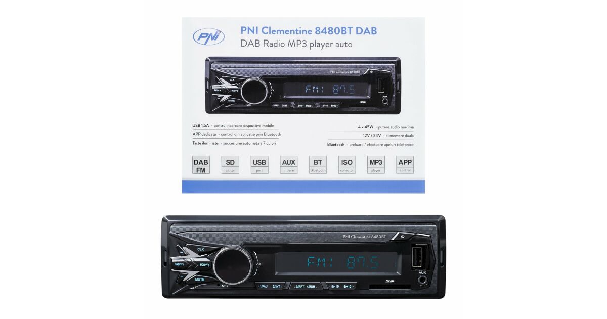 DAB a RDS rádio MP3 prehrávač do auta PNI Clementine 8480BT 4x45w, 12/24V, 1 DIN, s SD, USB, AUX, RCA, Bluetooth a 1,5A USB na nabíjanie telefónu