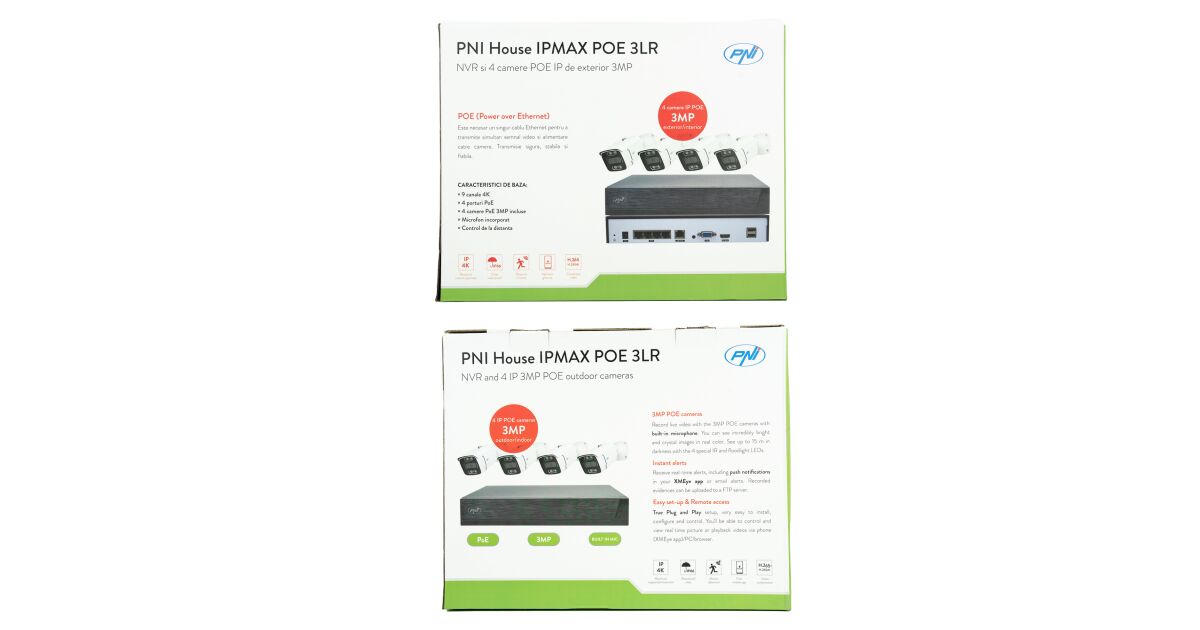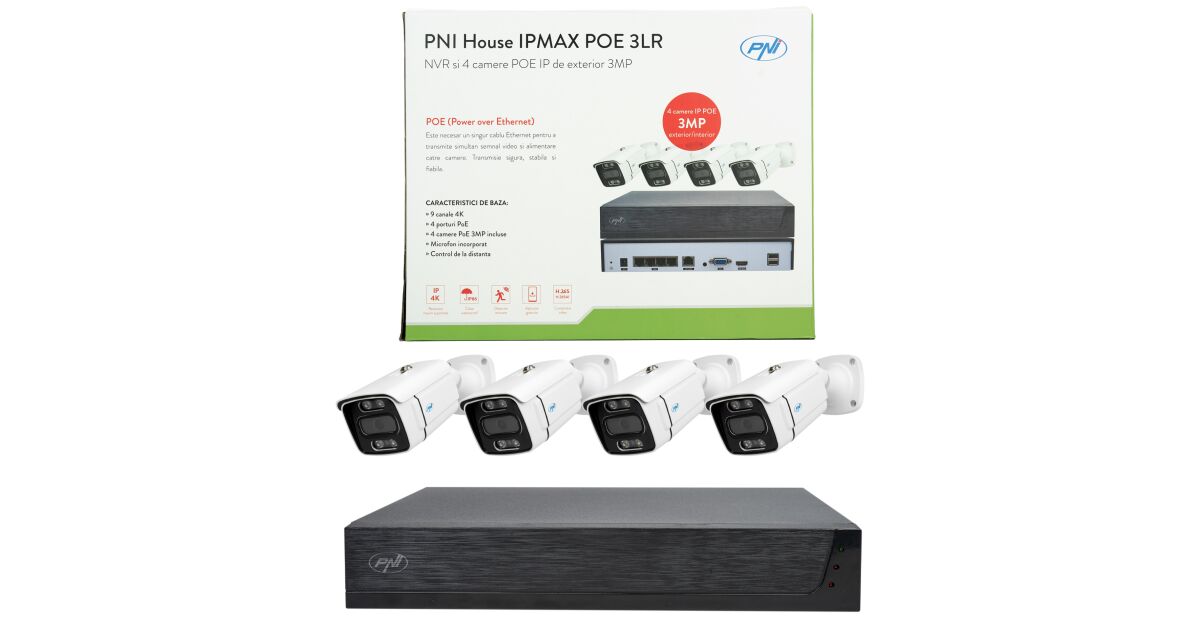 Súprava PNI House IPMAX POE 3LR Video Surveillance Kit, NVR so 4 portami POE, ONVIF a 4 kamerami s 3MP IP, vonkajšie, napájanie cez Ethernet, detekcia čipu, detekcia pohybu, 4 káble, napájanie, 1 TB H popis