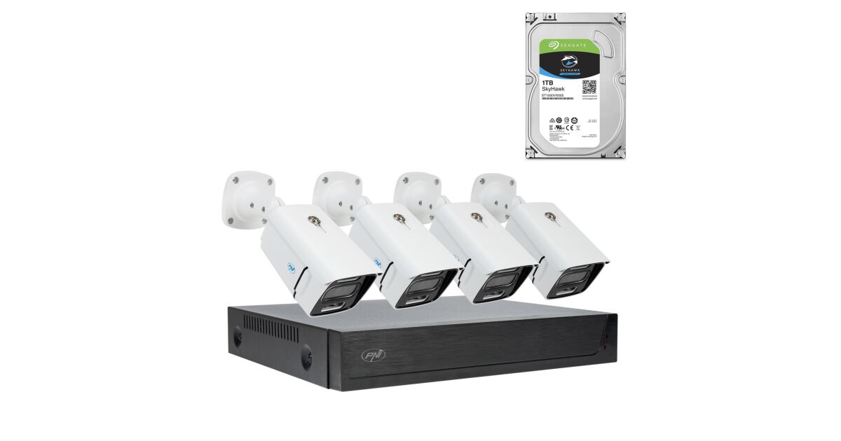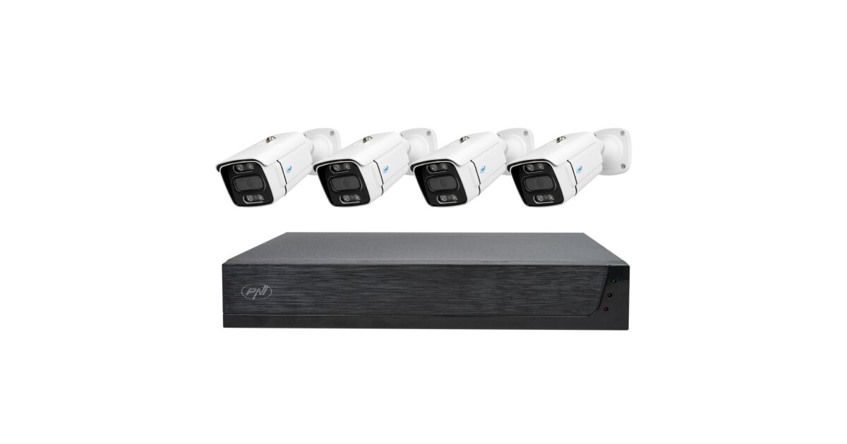 Súprava PNI House IPMAX POE 3LR Video Surveillance Kit, NVR so 4 portami POE, ONVIF a 4 kamerami s 3MP IP, vonkajšie, napájanie cez Ethernet, detekcia čipu, detekcia pohybu, 4 káble, napájanie, 1 TB H