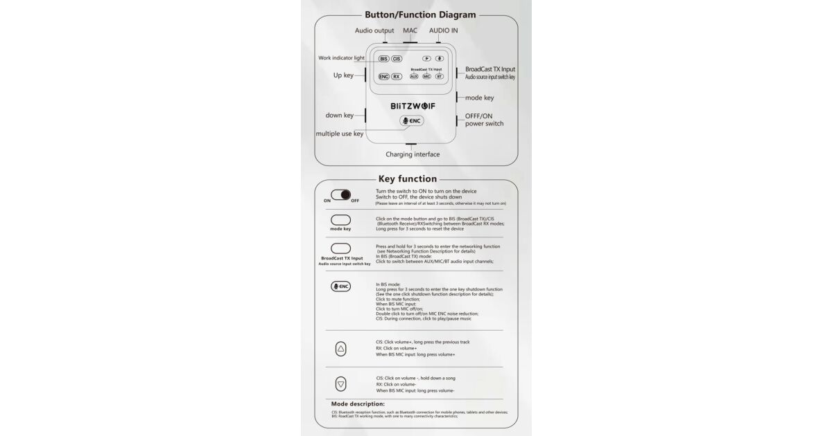 BlitzWolf® BW-LE523 - hudobný prijímač a vysielač Bluetooth V6.0 HD™ + vstavaný mikrofón, dosah 100 metrov popis