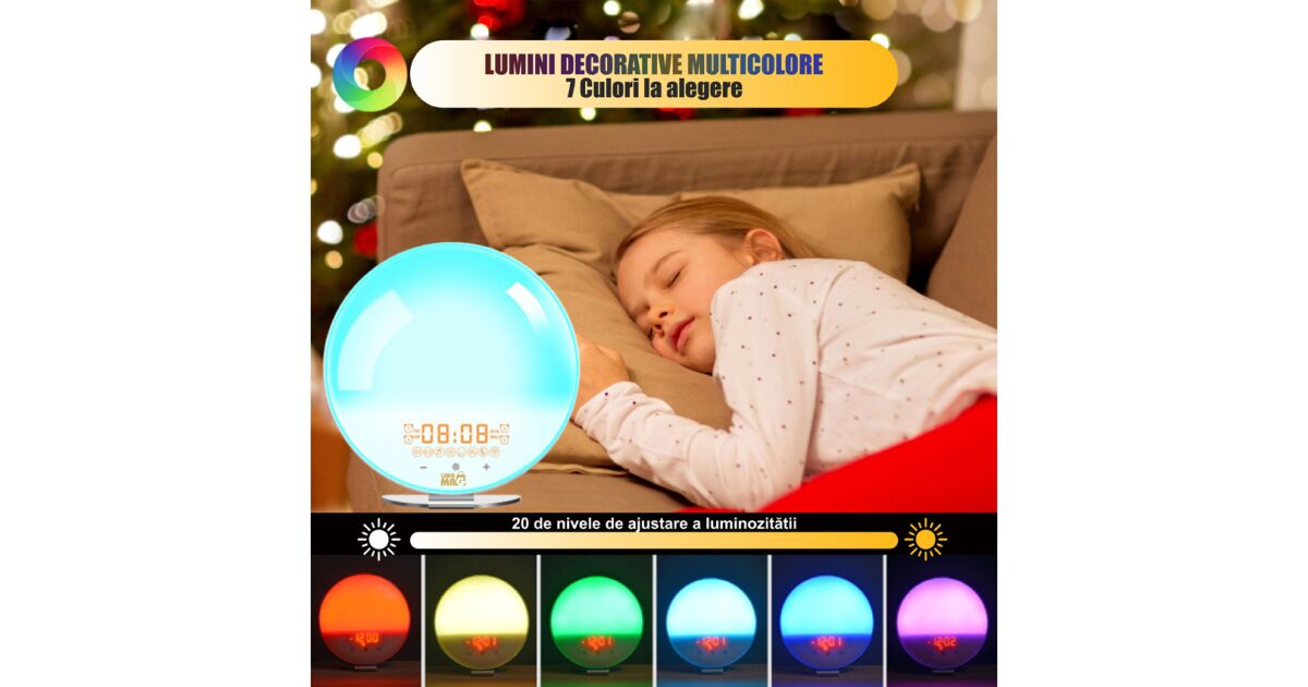 - Funkcia na podporu spánku: Simulácia západu slnka pomáha zmierniť problémy so spánkom.