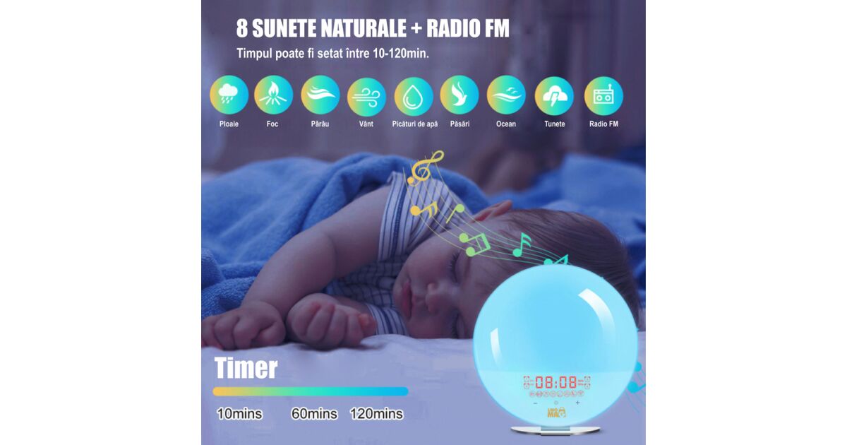 - 🎶 8 prírodných zvukov a FM rádio: Vyberte si zo štebotu vtákov, vĺn, dažďa a ďalších upokojujúcich zvukov alebo počúvajte svoju obľúbenú rozhlasovú stanicu.