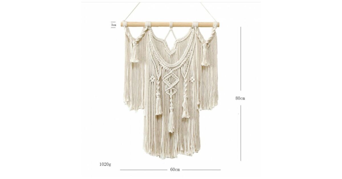 Krásná makramé v boho atmosféře se hodí do mnoha interiérůDekoraci lze použít i na focení nebo jako výzdobu na mnoho tematických oslavMakramé utkaná z 5 mm silné pletené bavlněné šňůry.Rozměry:- šířka tyče 55 cm-výška od tyče 70 cm