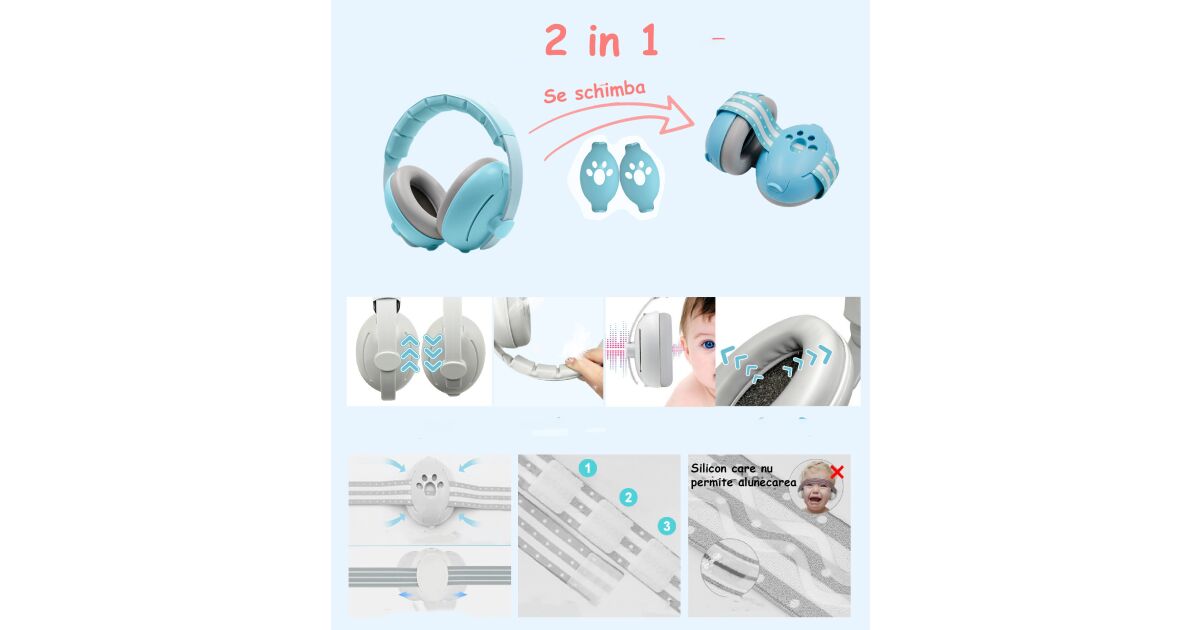 2 v 1 chrániče sluchu pre bábätká a deti 3-48 mesiacov WePro Store, mäkká a klasická elastická čelenka, ochrana sluchu v hlučnom prostredí, potlačenie hluku 25 dB, modrá popis