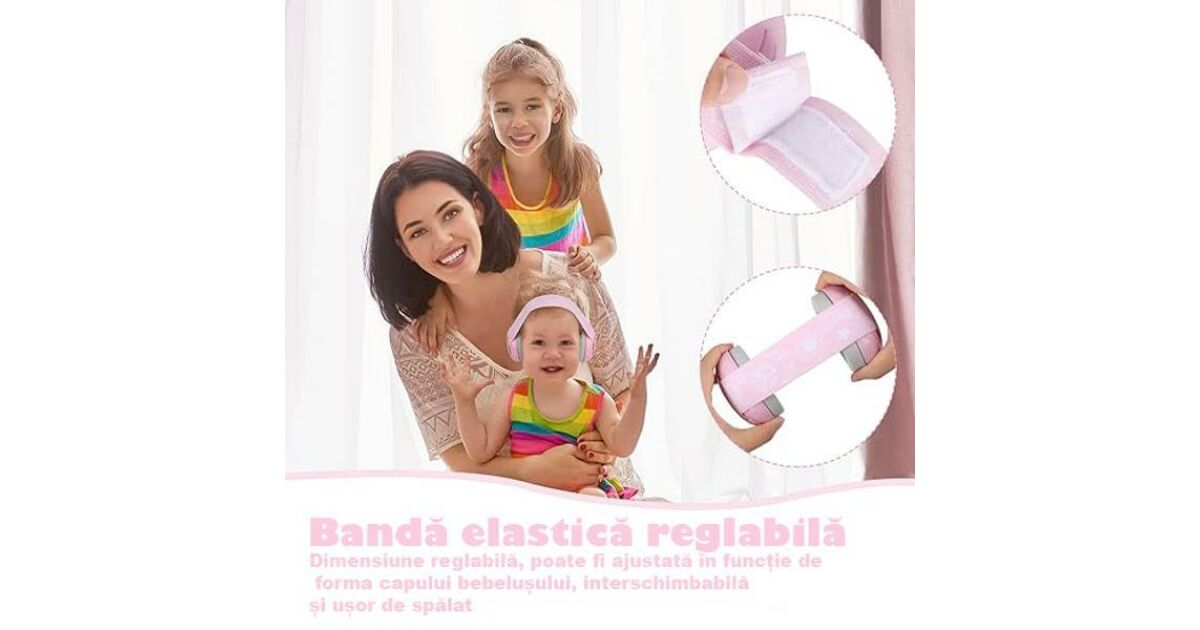 Chrániče sluchu pre deti a bábätká 3-36 mesiacov WePro Store, ochrana sluchu v hlučnom prostredí, bezpečný systém upevnenia na fontanelu, elastický hlavový most, jednoduché použitie, ružová s