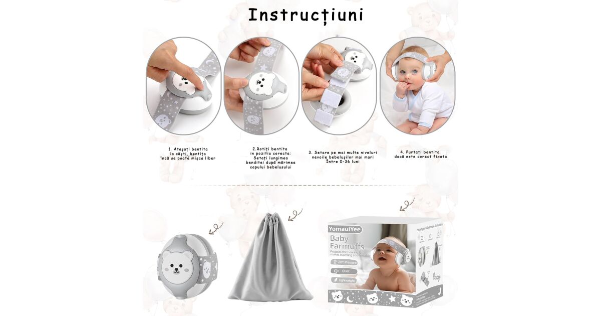 - Bezpečné uchytenie: Dizajn zabraňuje pádu chráničov sluchu a chráni fontanelu malého dieťaťa.