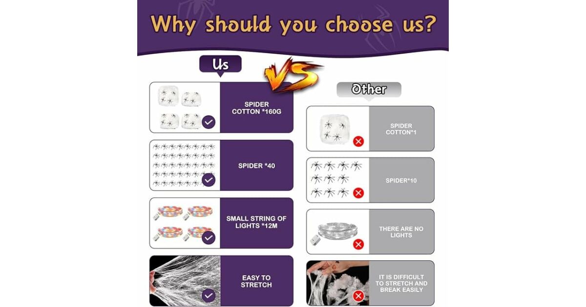 - Kvalitné materiály: Pavučina je odolná a pevná a pavúky sú realistické. LED svetlá sú ekonomické a bezpečné.