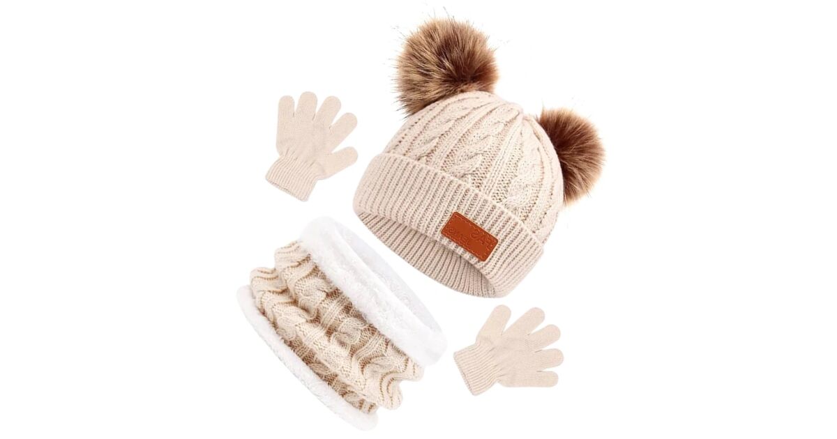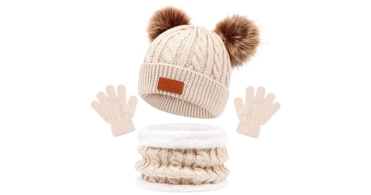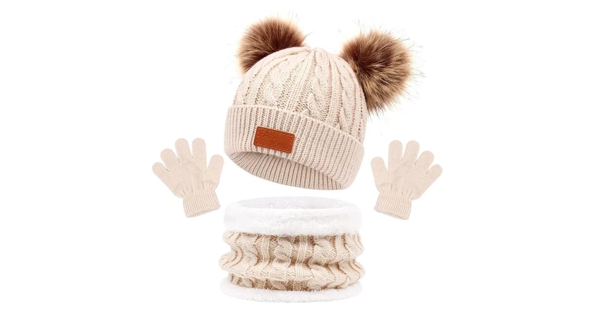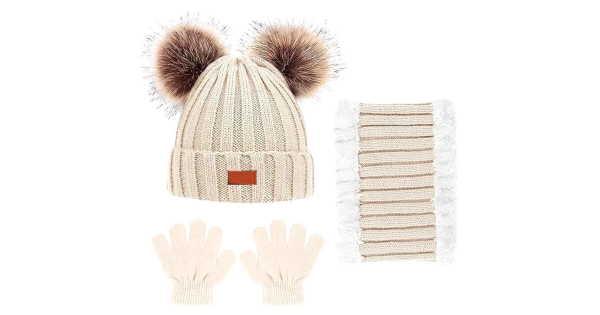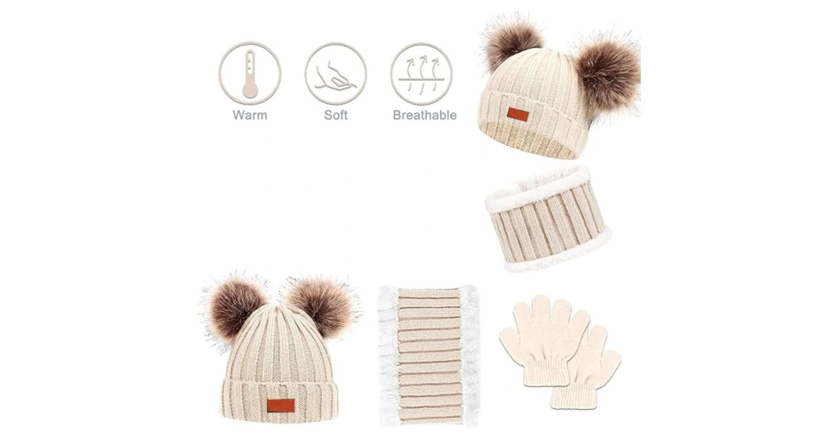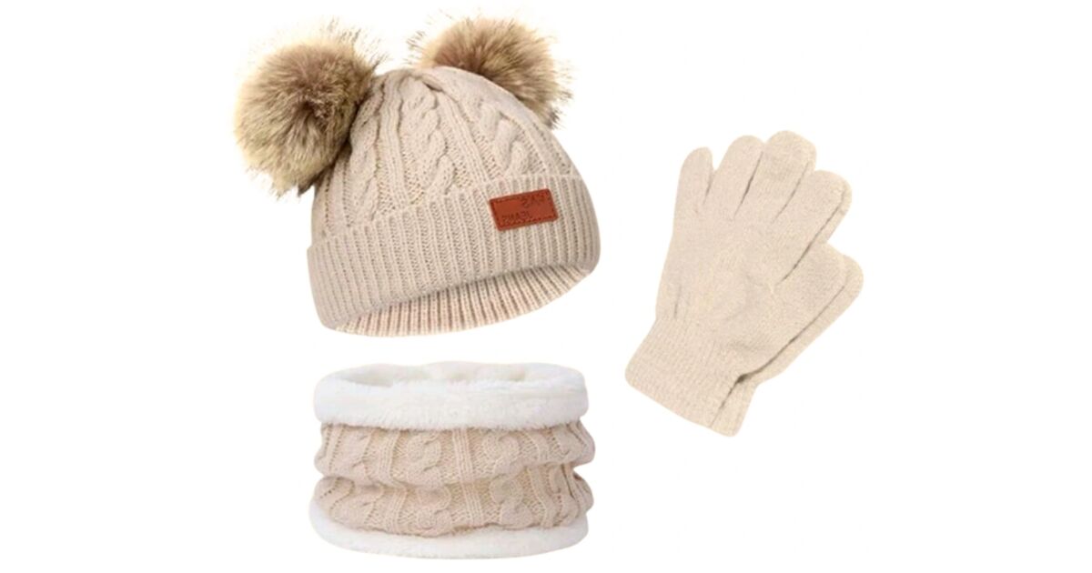 Táto rozkošná trojdielna súprava je ideálna pre vaše dieťatko počas chladných jesenných a zimných dní. Vyrobená zo 100% akrylového vlákna, je mäkká, teplá a príjemná na dotyk. Sada zahŕňa čiapku s dvoma roztomilými bambulkami, teplý nákrčník a elastické rukavičky.