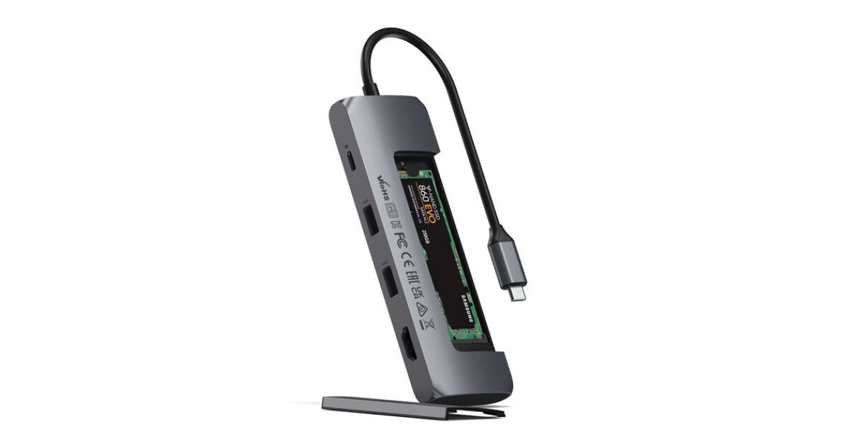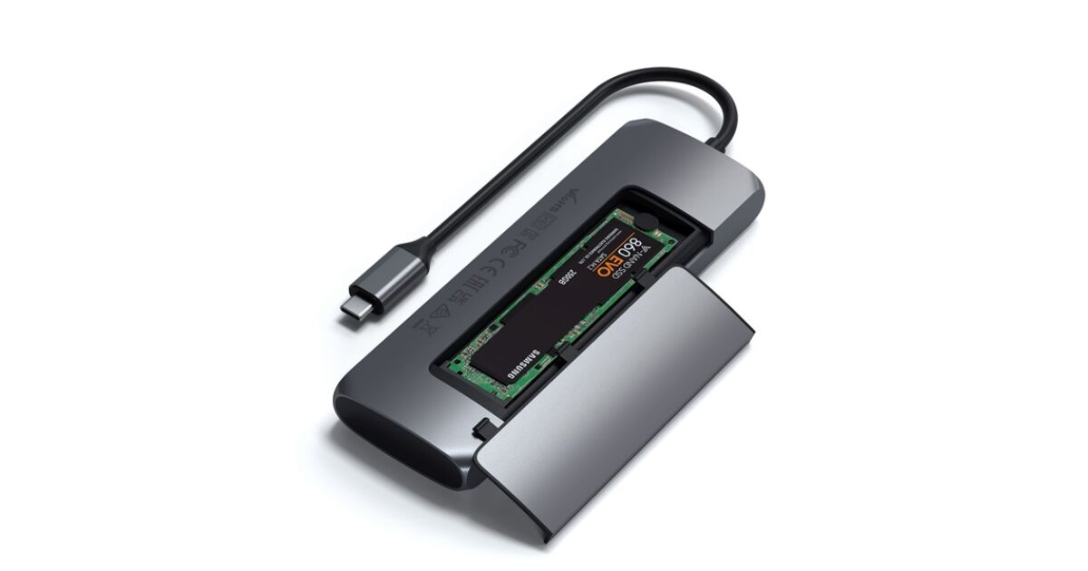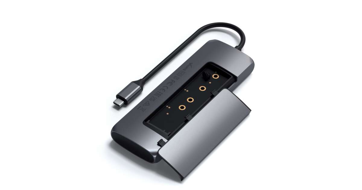 -Satechi Hliníkový hybridný multiportový adaptér USB-C (kryt SSD, HDMI 4K, 2 x USB-A 3.1 Gen 2 do 10 Gb/s) - vesmírne sivý popis