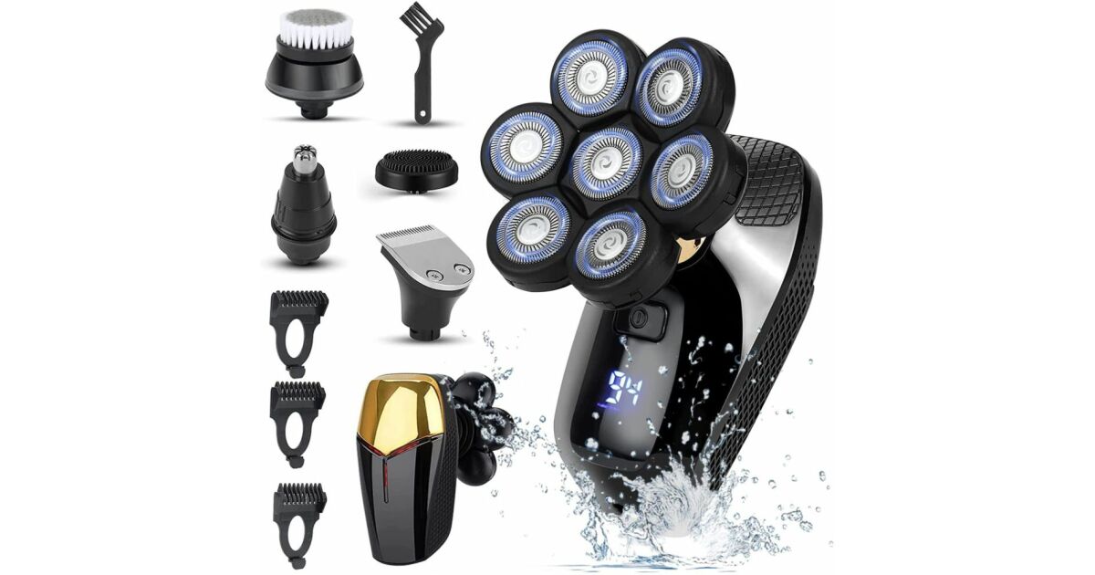 Multifunkčný elektrický holiaci strojček Linomag®, profesionálny, 7D 5 v 1 s flexibilnými rotačnými hlavami, LED displej, vodeodolný, nabíjateľný cez USB, na vlasy, bradu, nos a kontúry, čier