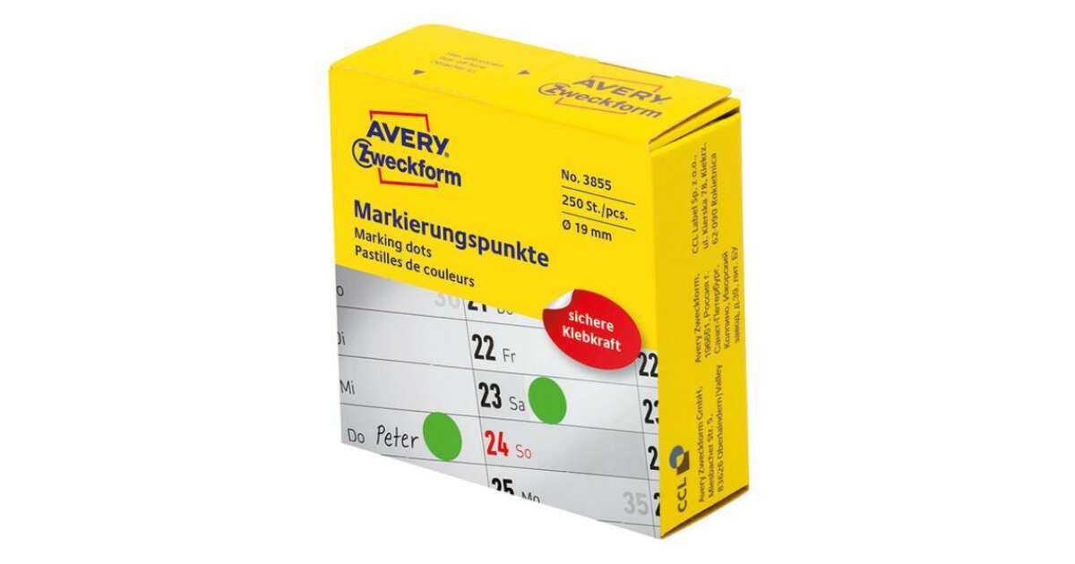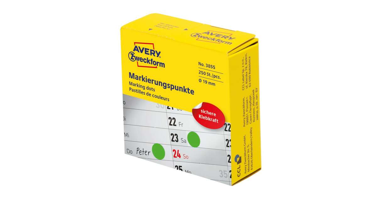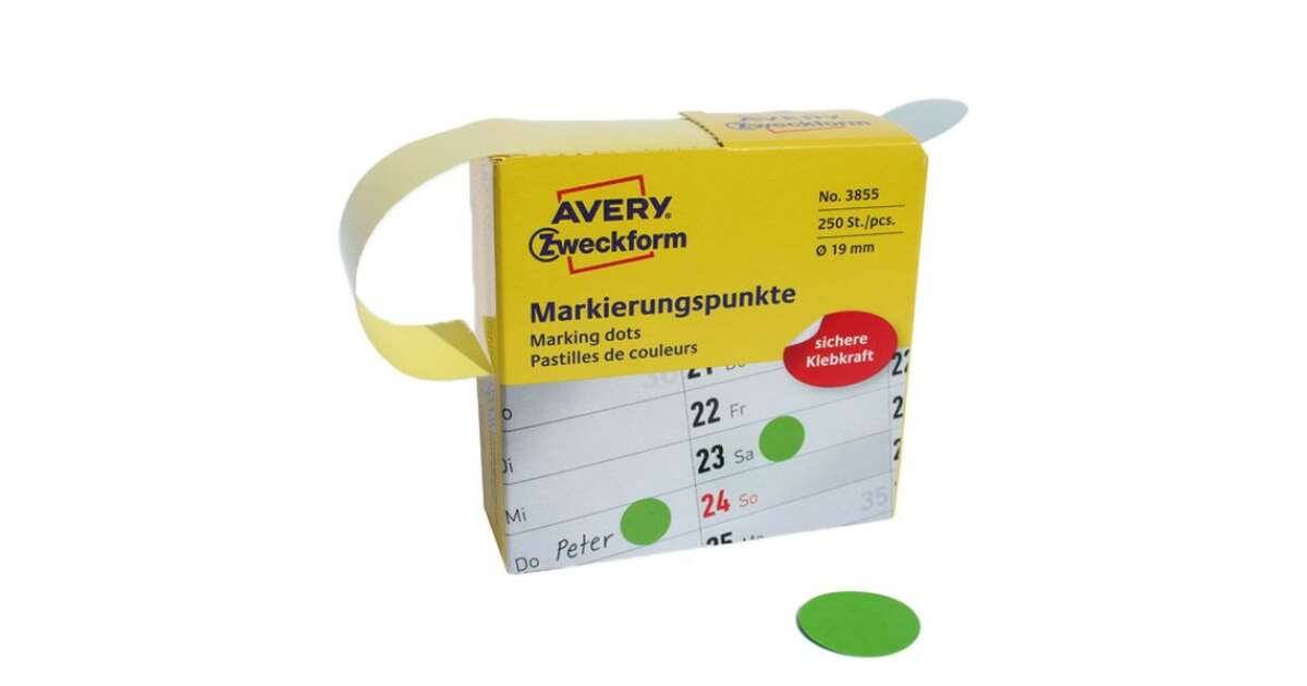 Praktický kotúčik s 250 ks 19 mm priemeru, jasnozelených lepiacich bodiek Avery Zweckform. Perfektné na označovanie kalendárov, máp, dokumentov alebo kreatívnych projektov.